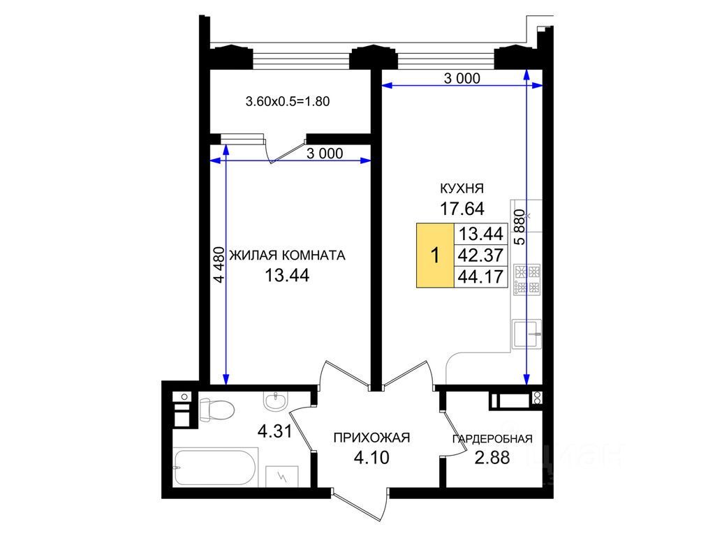 Общая площадь44,17 м²