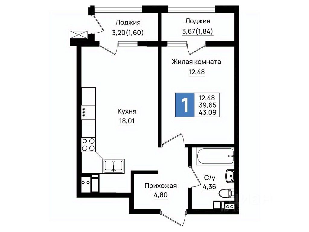 Общая площадь43,09 м²