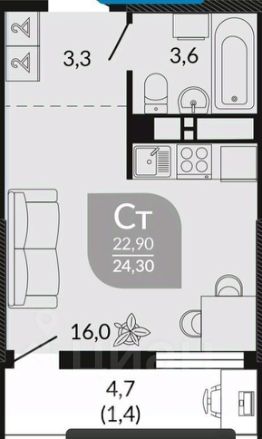 Основные характеристики: общая площадь квартиры — 24,3 кв. м; жилая площадь — 22,9 кв. м; высота потолков — 2,8 метра; тип планировки — студия.