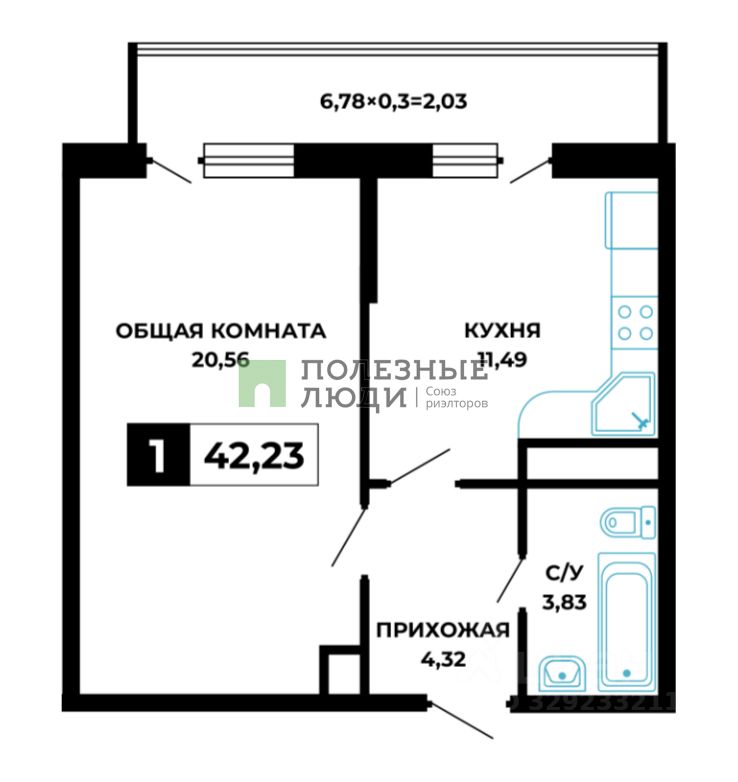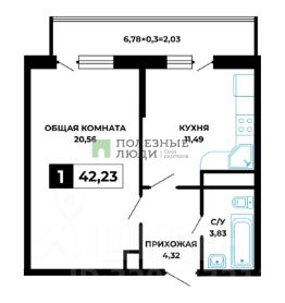 Комната и кухня ровной прямоугольной формы.
