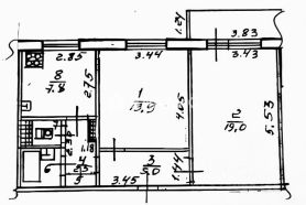 Общая площадь квартиры составляет 52,2 кв. м, из них площадь кухни — 8 кв. м. Две комнаты (19 кв. м и 14 кв. м) изолированы, что создаёт комфорт и уединение.
