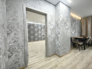 Интерьер продуман до мелочей. На стенах поклеены дорогие и качественные обои шелкография, придающие пространству уют и благородный вид. На полу уложен износостойкий качественный ламинат, установлены стильные новые межкомнатные двери. Особая гордость — система освещения. Смонтированы матовые натяжные потолки с многоуровневым светом: в подвесном потолке встроены точечные светильники, по периметру пущена дополнительная мягкая подсветка, в спальне висит красивая люстра, а в коридоре установлен стильный потолочный светильник. Выведено множество дополнительных выключателей для создания любой атмосферы.