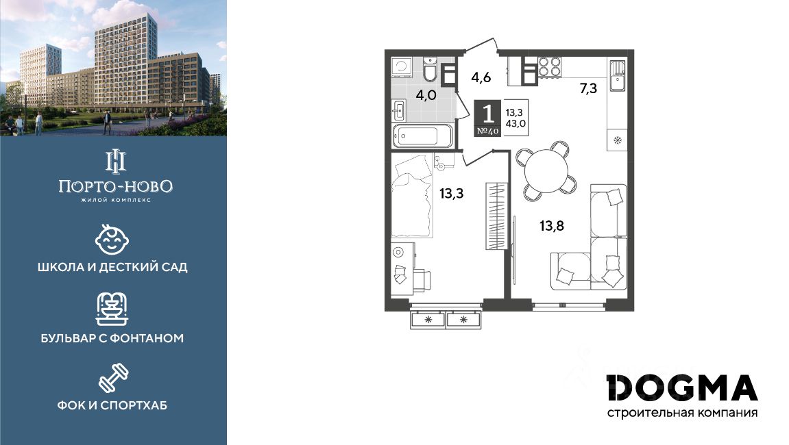Срок сдачи: 4 кв. 2026, общей площадью 43 кв.м., на 8 этаже.