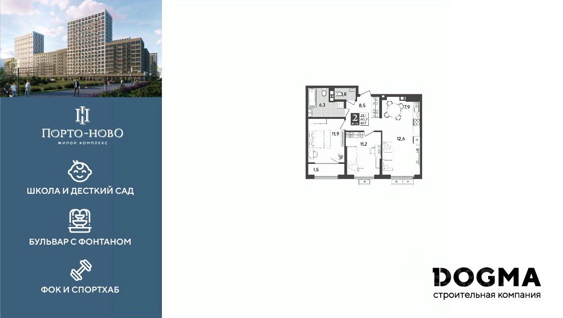 Срок сдачи: 4 кв. 2026, общей площадью 61.7 кв.м., на 7 этаже.
