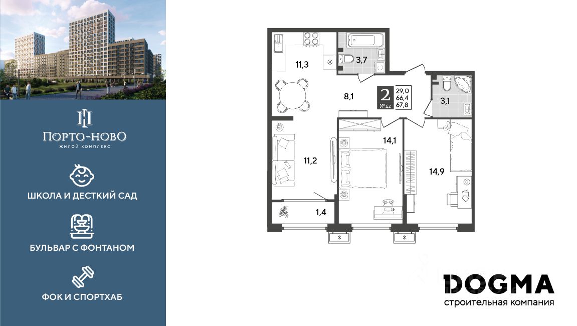 Срок сдачи: 4 кв. 2026, общей площадью 67.8 кв.м., на 2 этаже.