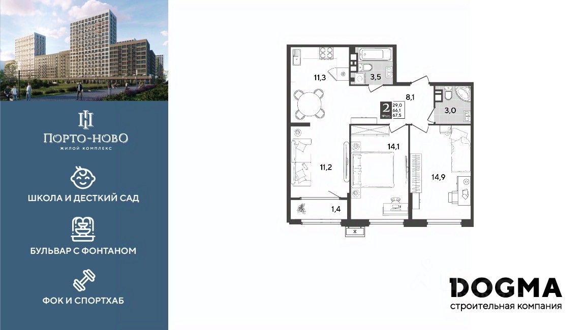 Срок сдачи: 4 кв. 2026, общей площадью 67.5 кв.м., на 9 этаже.
