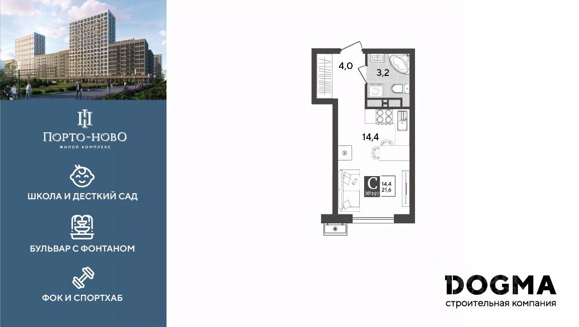 Срок сдачи: 4 кв. 2026, общей площадью 21.6 кв.м., на 15 этаже.