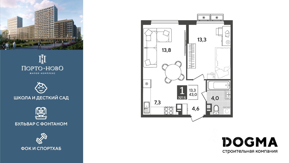 Срок сдачи: 4 кв. 2026, общей площадью 43 кв.м., на 3 этаже.