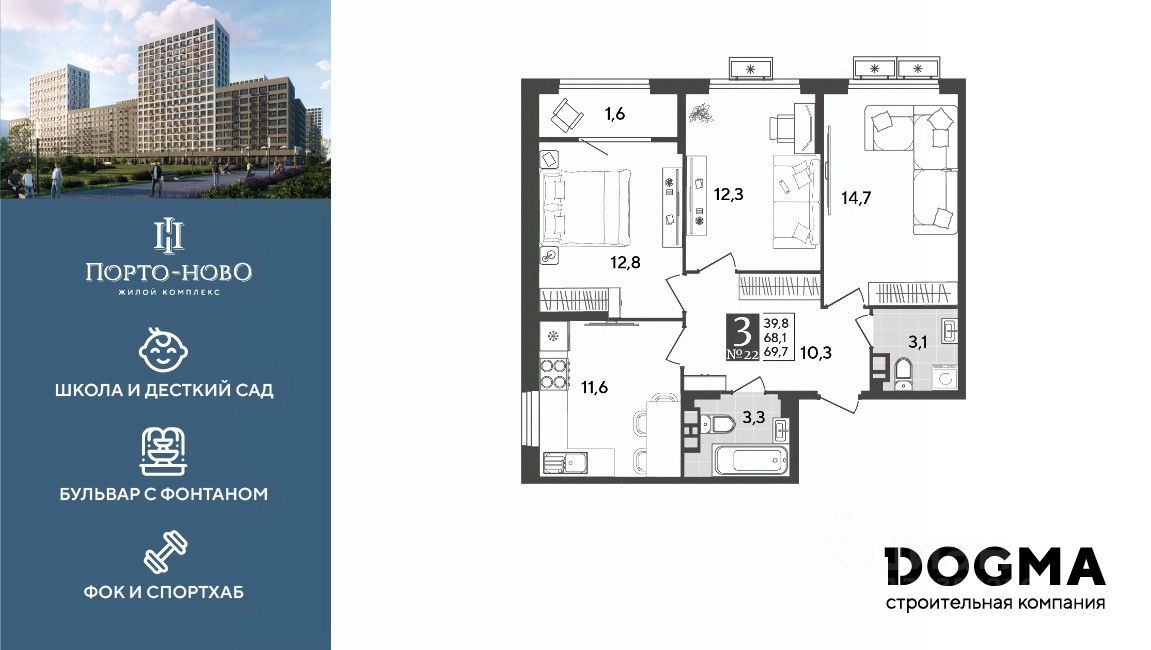 В продаже 3-комнатная квартира от застройщика! ЖК "Порто-Ново" г. Новороссийск, Литер 7