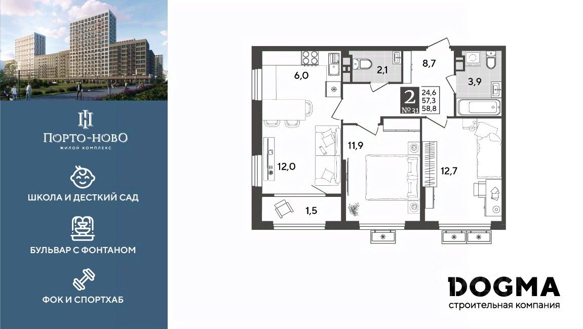 Срок сдачи: 4 кв. 2026, общей площадью 58.8 кв.м., на 8 этаже.