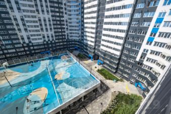 Во дворах реализована концепция "активити-парка" — это большое зелёное пространство для отдыха и занятий спортом: