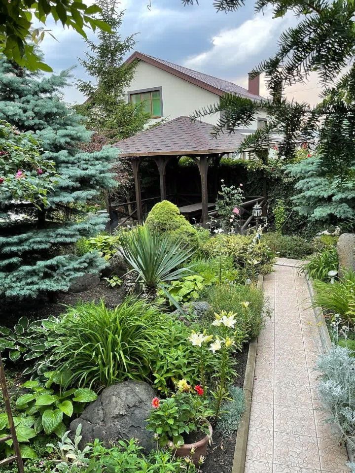 Хороший вместительный двор. Беседка и клумбы с цветами, стационарный мангал совмещен с тандыром. Рядом с баней помещение для хранения дров и всякой всячины. Газ центральный, вода скважина,