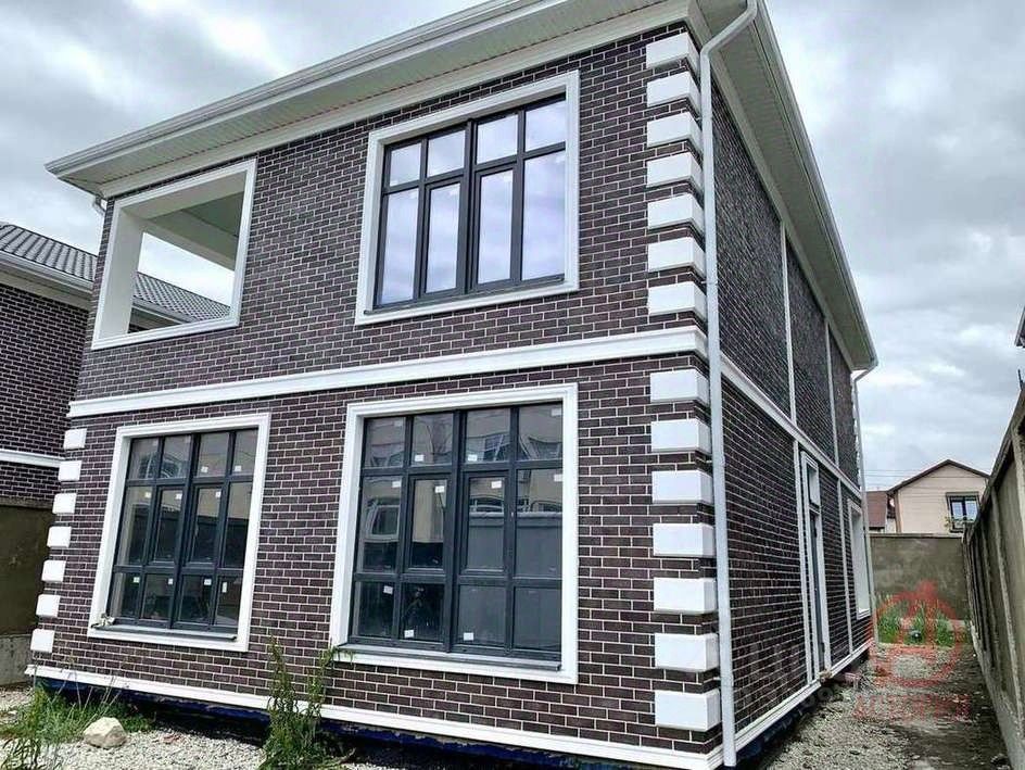 Фасад облицован декоративным кирпичом. Свайно-ростверковый фундамент. Стены монолит заполнение блок. Окна металлопластиковые с ламинацией. Внешние фасады отделаны утеплителем и декоративными элементами. Крыша отделана металлочерепицей. Входная металлическая дверь.