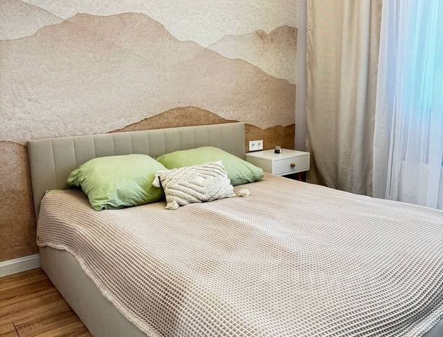 В спальне 18 кв.м: установлена большая, просторная кровать 180*200 с высоким, качественным матрасом средней жестокости и подъемным механизмом для хранения ваших вещей, по обеим сторонам от кровати расположены подвесные тумбы и светильники с комфортным, теплым светом.