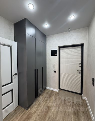 В прихожей установлено большое зеркало от потолка до пола в черной рамке. Также шкаф для хранения вашей верхней одежды.